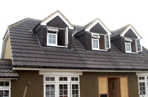 Marley interlocking tiles fitted to a full new roof. Marley heritage plain tiles fitted to dormer roofs.